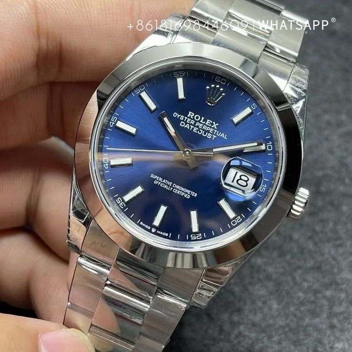 This Rolex DATEJUST features a "smooth" bezel design, which is priced slightly lower than the "fluted" bezel model. The watch has a more minimalist style, and the design of this model has remained largely unchanged over the years, making it a classic chaice. The dial has a sunray finish in a blue color. It is powered by the replica 3235 movement, which offers a 70-hour power reserve when fully wound. This watch is highly suitable for everyday wear and can complement any occasion. The case diameter is 41mm, and there are multiple dial color options avallable.