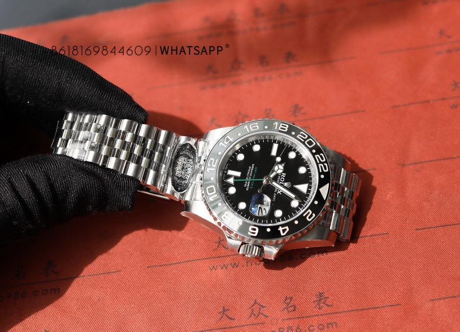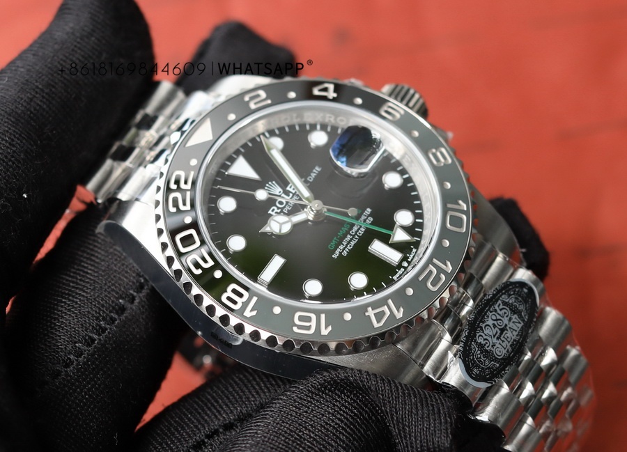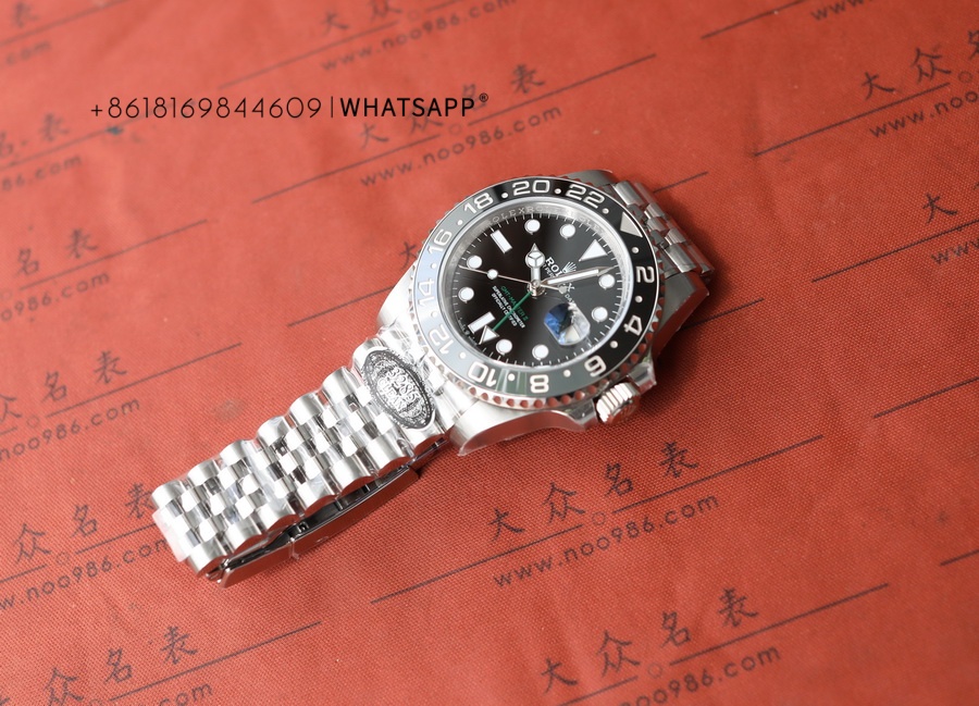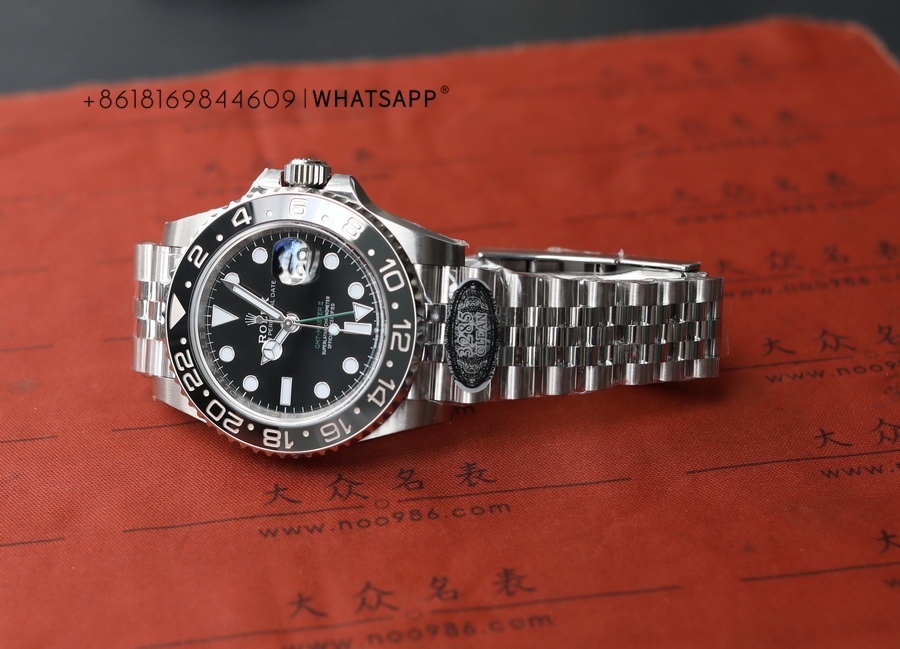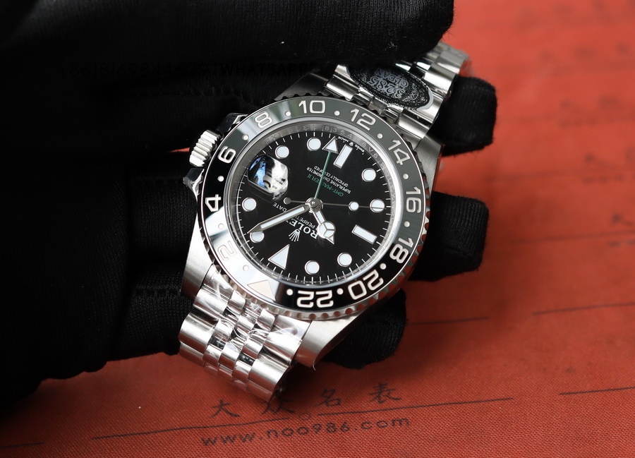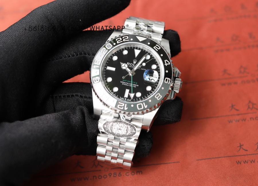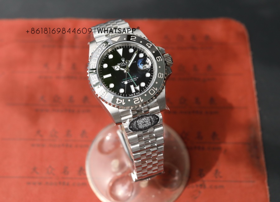 This is a full-black replica Rolex OYSTER PERPETUAL GMT-Master II watch, with two types of straps available for selection. The watch has a diameter of 40mm, made of 904L steel, and the movement model is 3285, with a power reserve of up to 70 hours. The all-black ceramic bezel eliminates concerns about color differences, and its waterproof performance is identical to that of the SUBMARINA series.