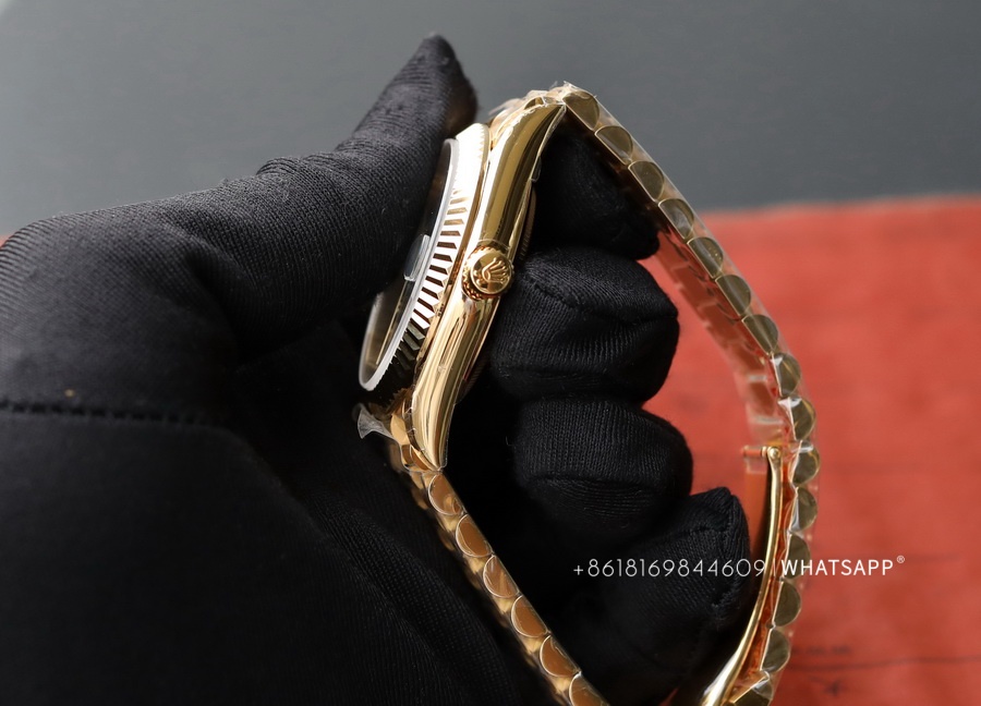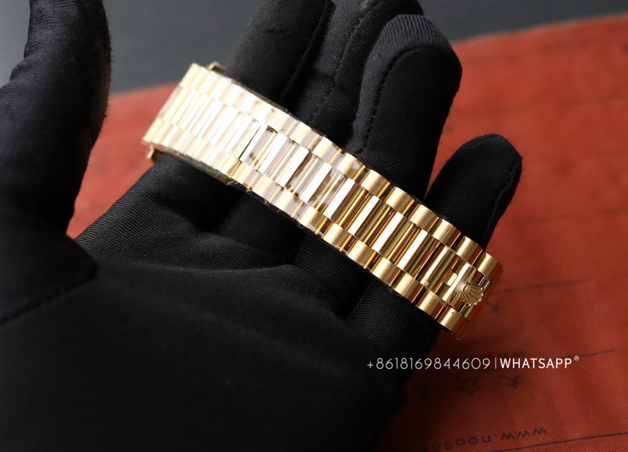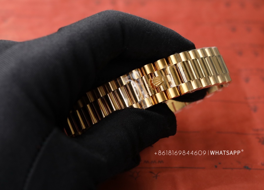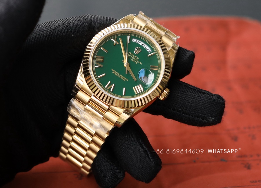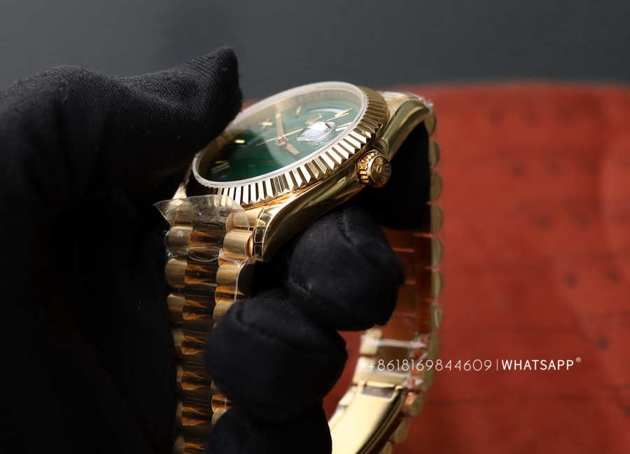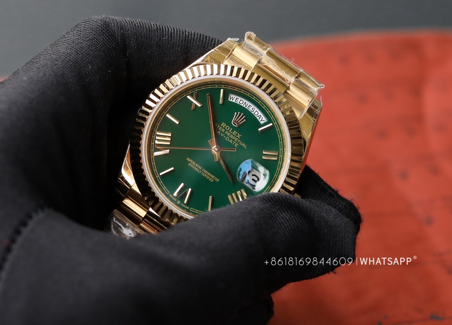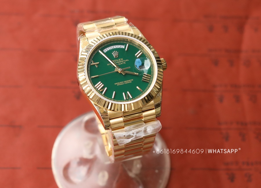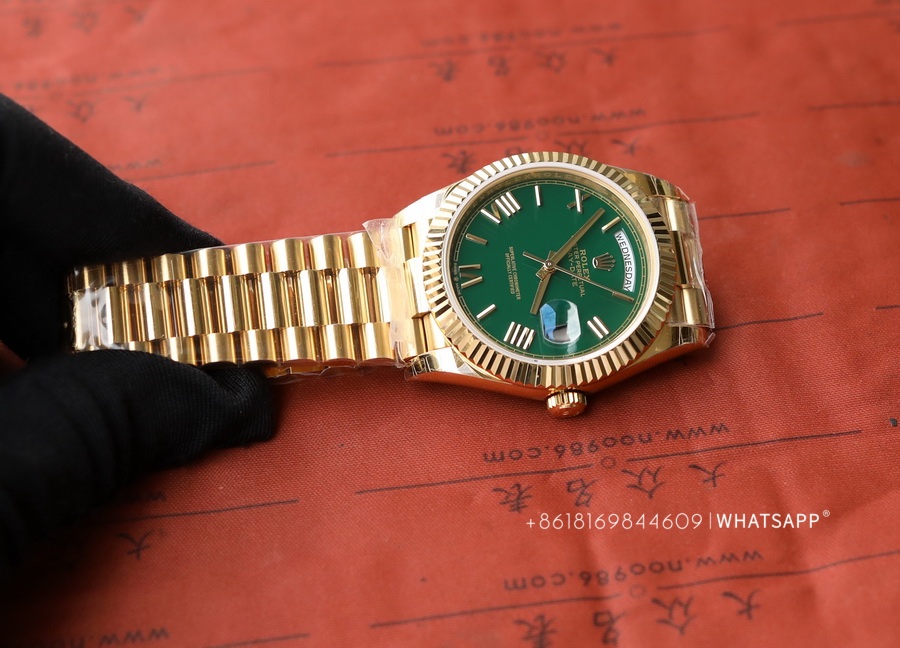 Today, we will introduce a Rolex Day-Date series watch with a green dial, measuring 40mm in diameter. It comes with two movement options: the 2824 or the 3255. One notable feature of this watch is its dial color, adopting a "roulette" green design. The genuine version uses 18K yellow gold, exuding a luxurious feel overall. The factory later produced a 1:1 replica of this Rolex Day-Date, adding extra weight inside the watch to achieve a weight closer to the original. Rolex offers a wide range of color combinations for the Day-Date series, which we will gradually introduce in future articles.