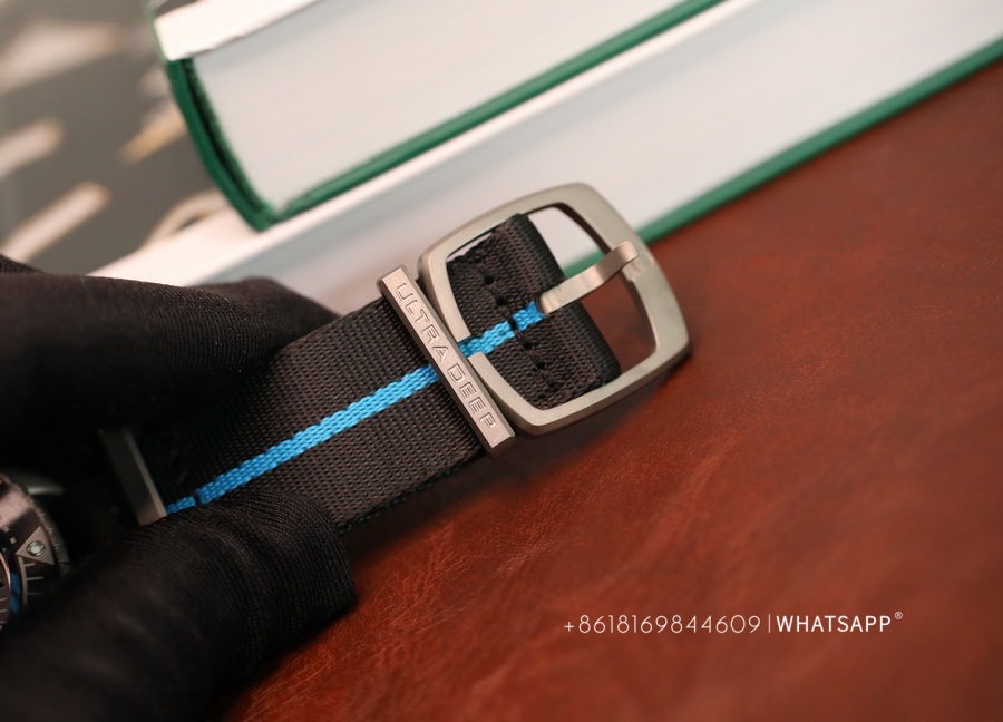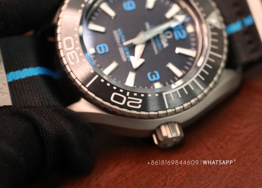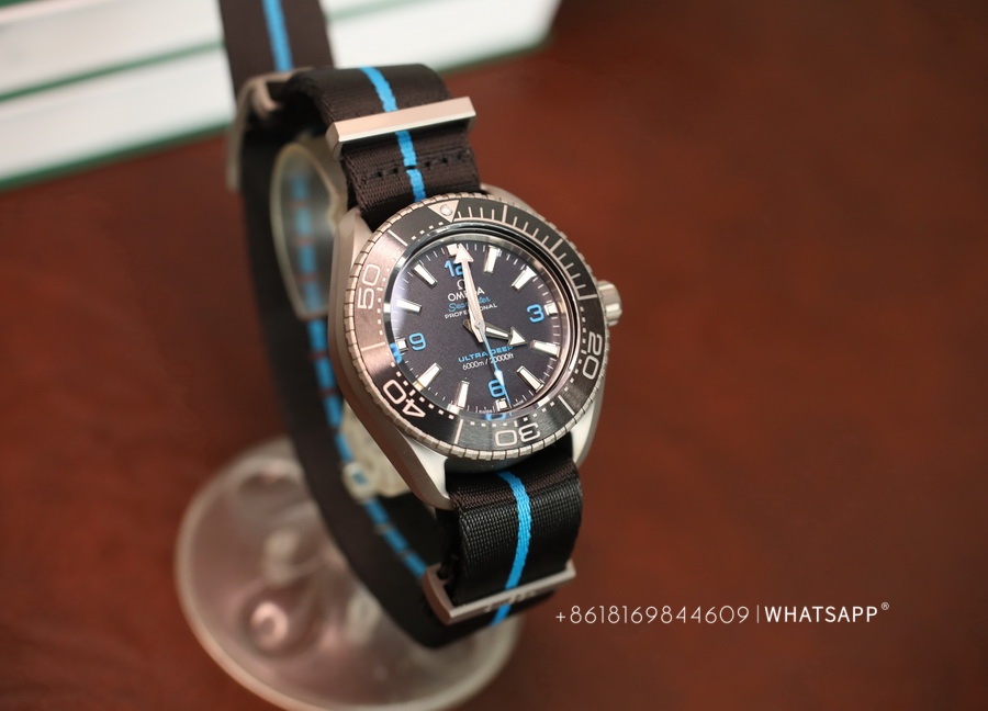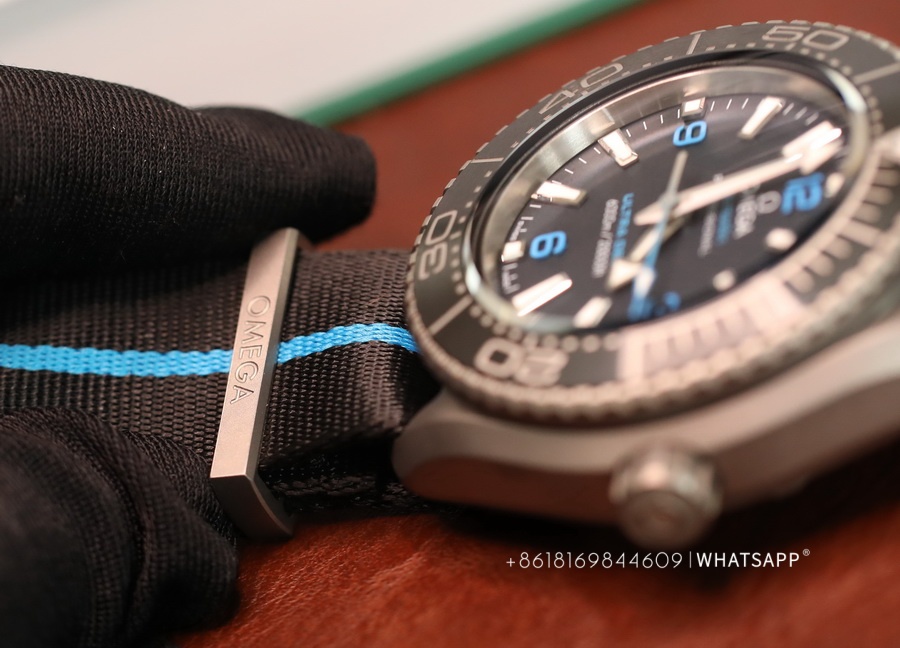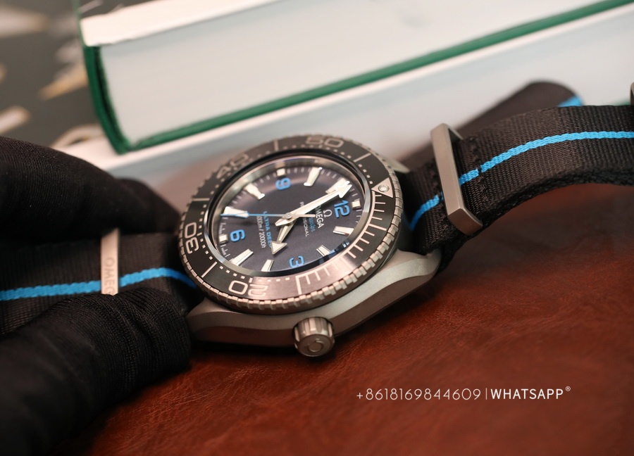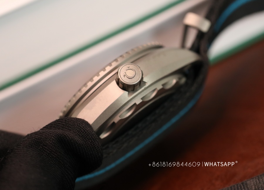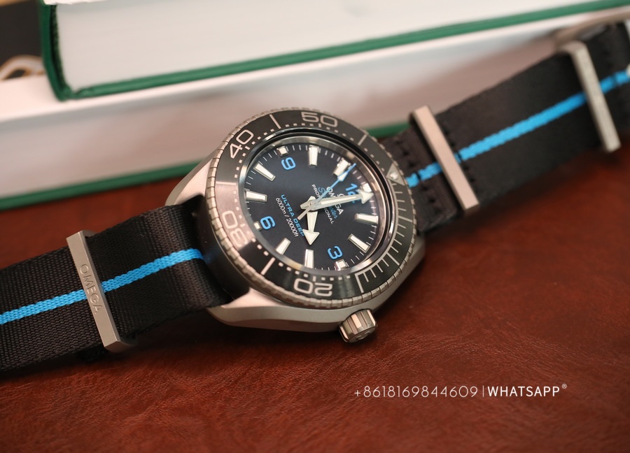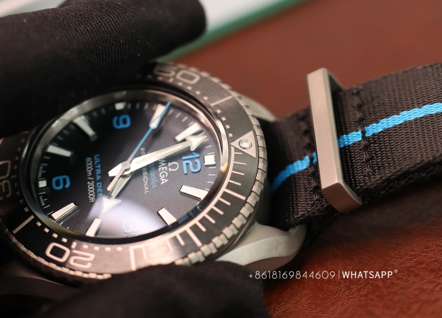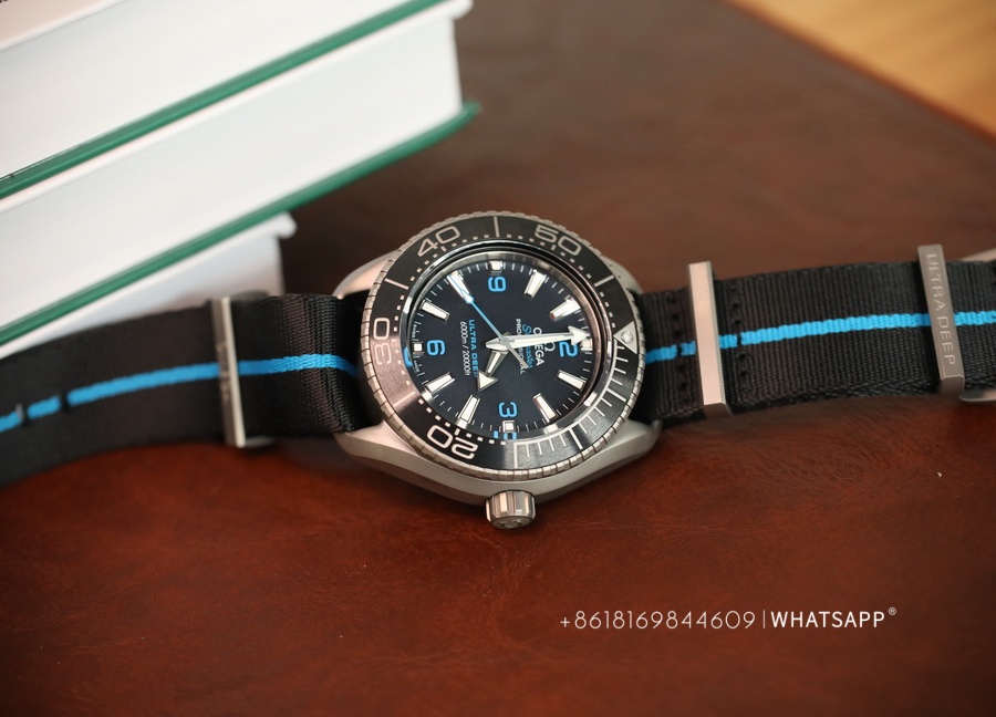 The movement of this watch and the previously introduced ULTRA DEEP SEAMASTER steel model are the same, using the identical 8912 movement. However, the watch is significantly lighter, weighing only around 118g. The case is made of titanium, providing a more robust exterior, paired with a canvas strap for added convenience during underwater activities. This is a sporty, large-scale Omega ULTRA DEEP SEAMASTER watch with excellent craftsmanship.