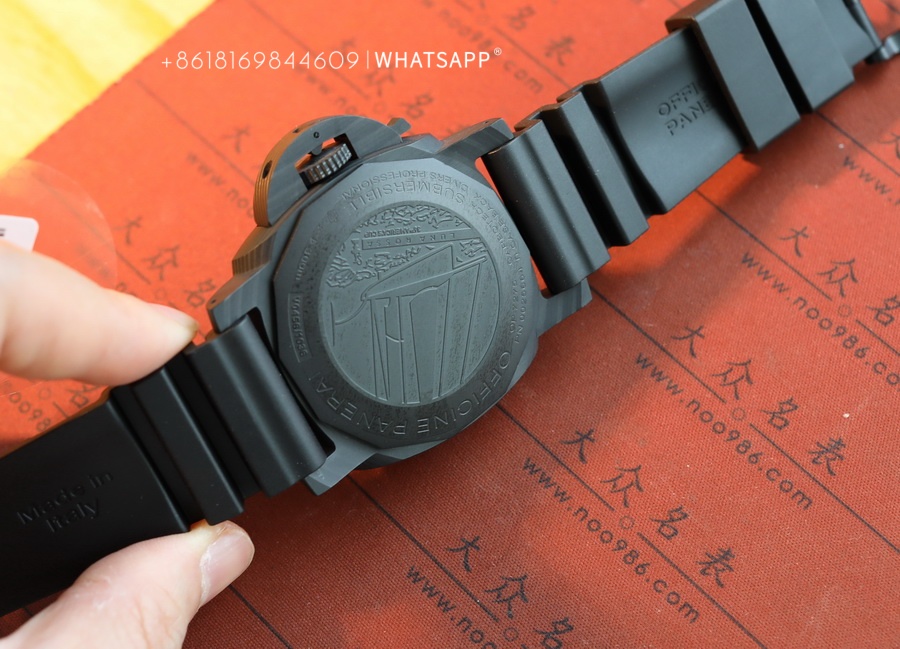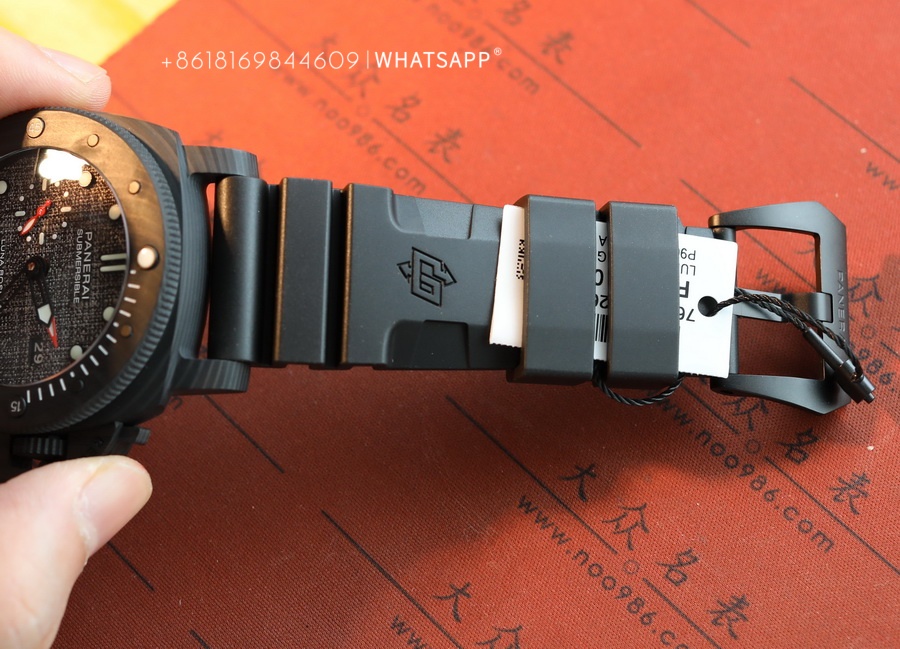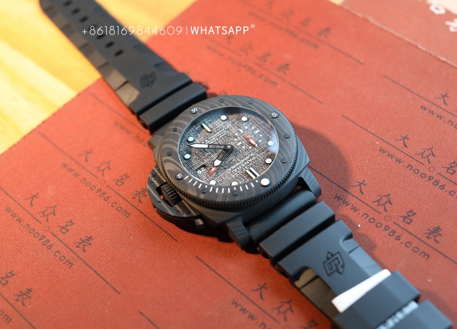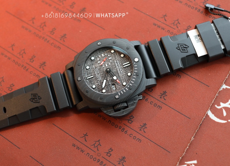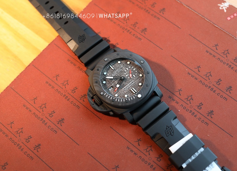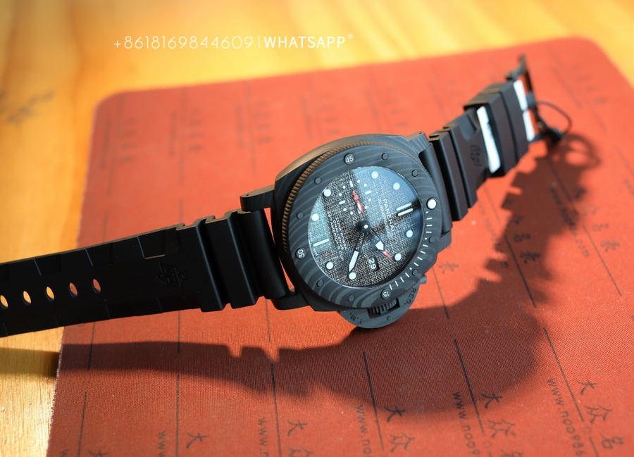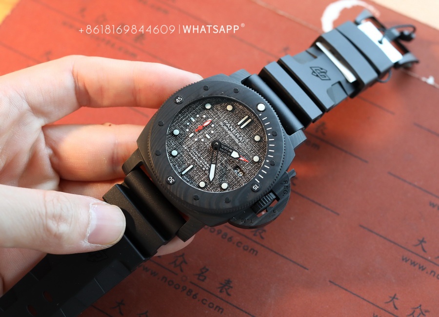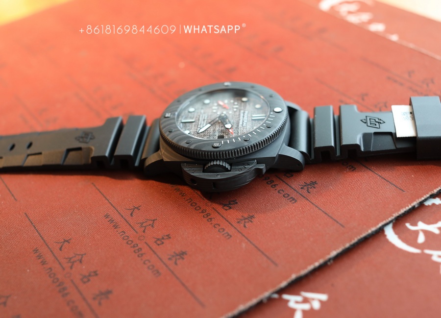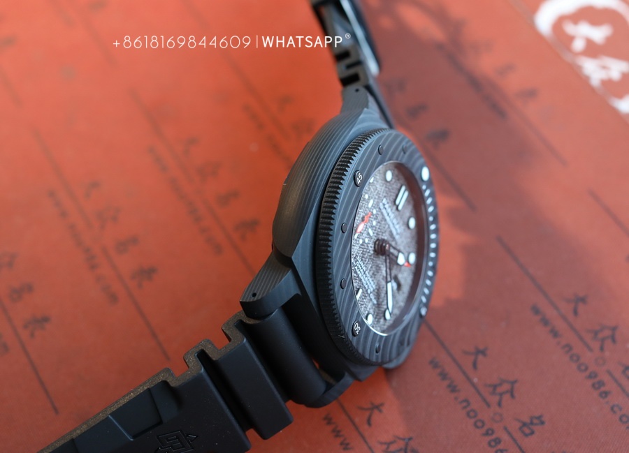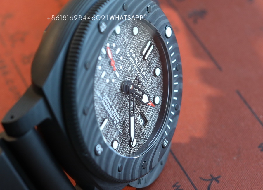 The VS factory Panerai PAM01039 1:1 replica watch maintains the authentic 47mm size. The watch is crafted entirely with carbotech material, known for its lightweight nature, high hardness, and distinctive irregular patterns. VS factory excels in both material and pattern details. A unique feature of this carbon fiber Panerai is the canvas-textured dial, a rarity in the Panerai series. The watch’s bridge and case protector are also made of full carbon fiber.