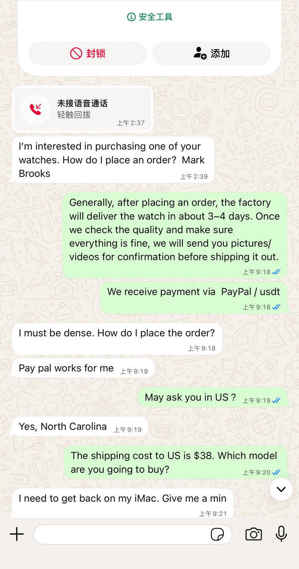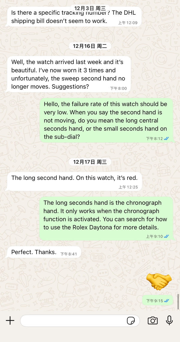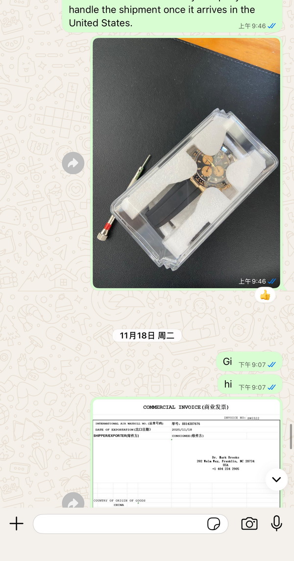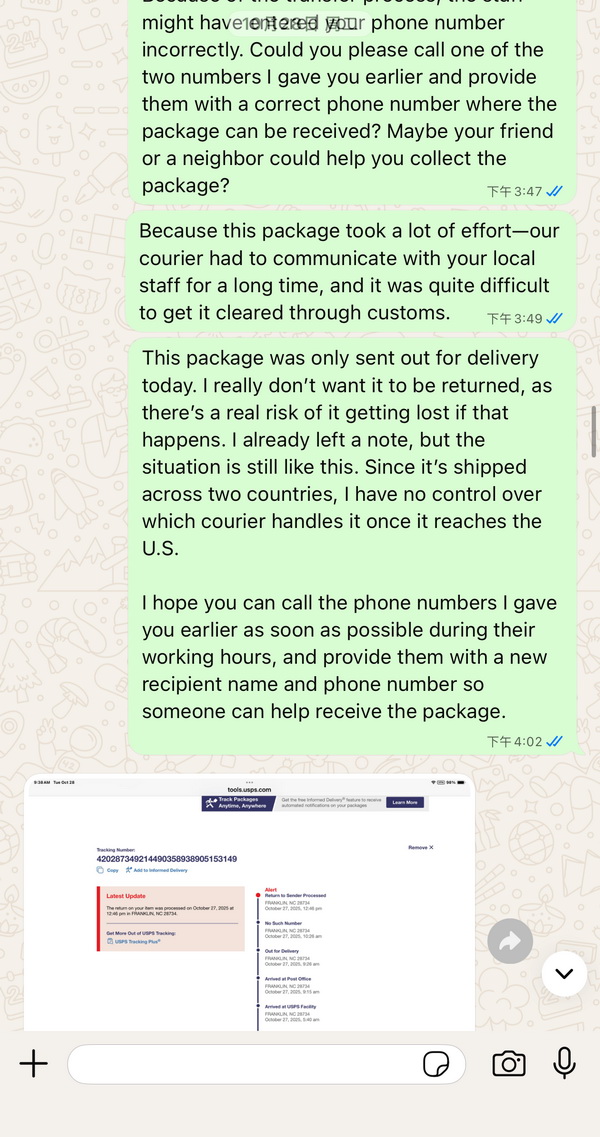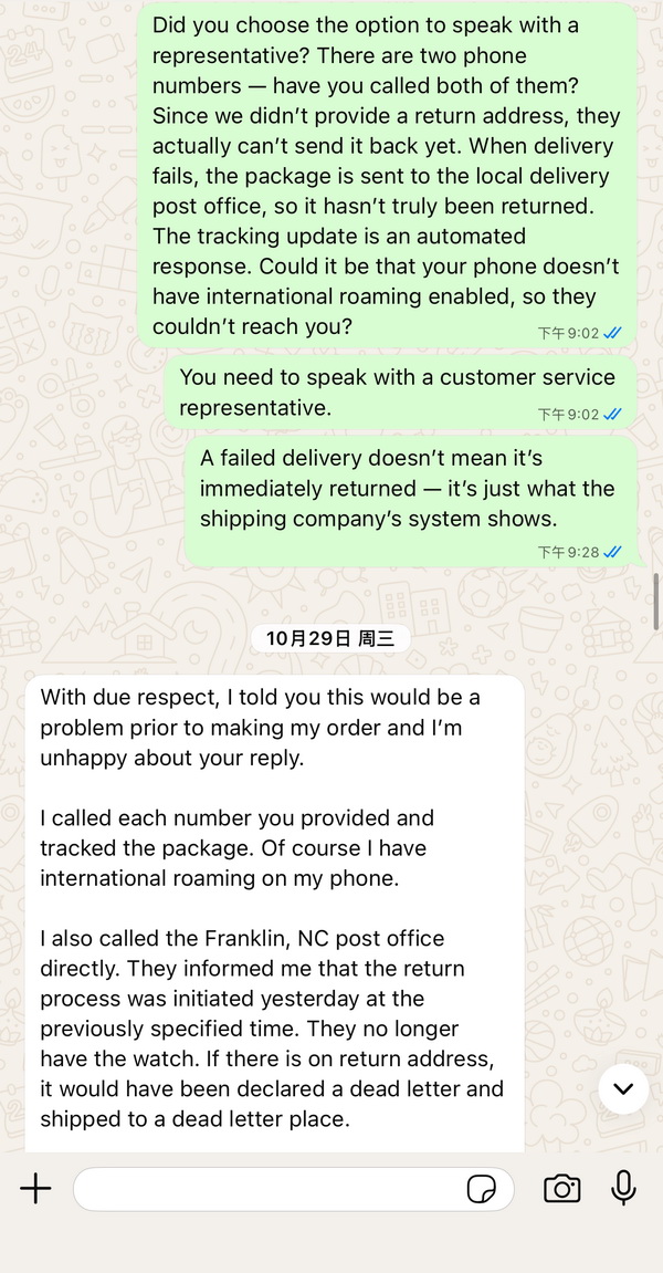 This purchase was made during the period of China–US trade tensions, when U.S. customs inspections on shipments from China were particularly strict. The courier we used at that time was UPS. After the parcel arrived in the United States, delivery was unsuccessful due to the customer’s residential address situation. Coincidentally, the customer was traveling in Europe and tried multiple times to contact the courier company without success. In the end, the parcel was treated as unclaimed and the customer did not receive it. During this time, we communicated with both the courier company and the customer. After discussions, we voluntarily took responsibility for the lost shipment and resent the watch to the customer. The matter was ultimately resolved successfully. What we want to express is that although we have never met our customers in person and may never meet them in our lifetime, as a responsible seller, once the goods are shipped but have not reached the buyer, we will always bear the risk of loss. Some of the screenshots in this article show the problems we encountered during shipping and how we resolved them. We hope this will give new customers sufficient confidence in our integrity.